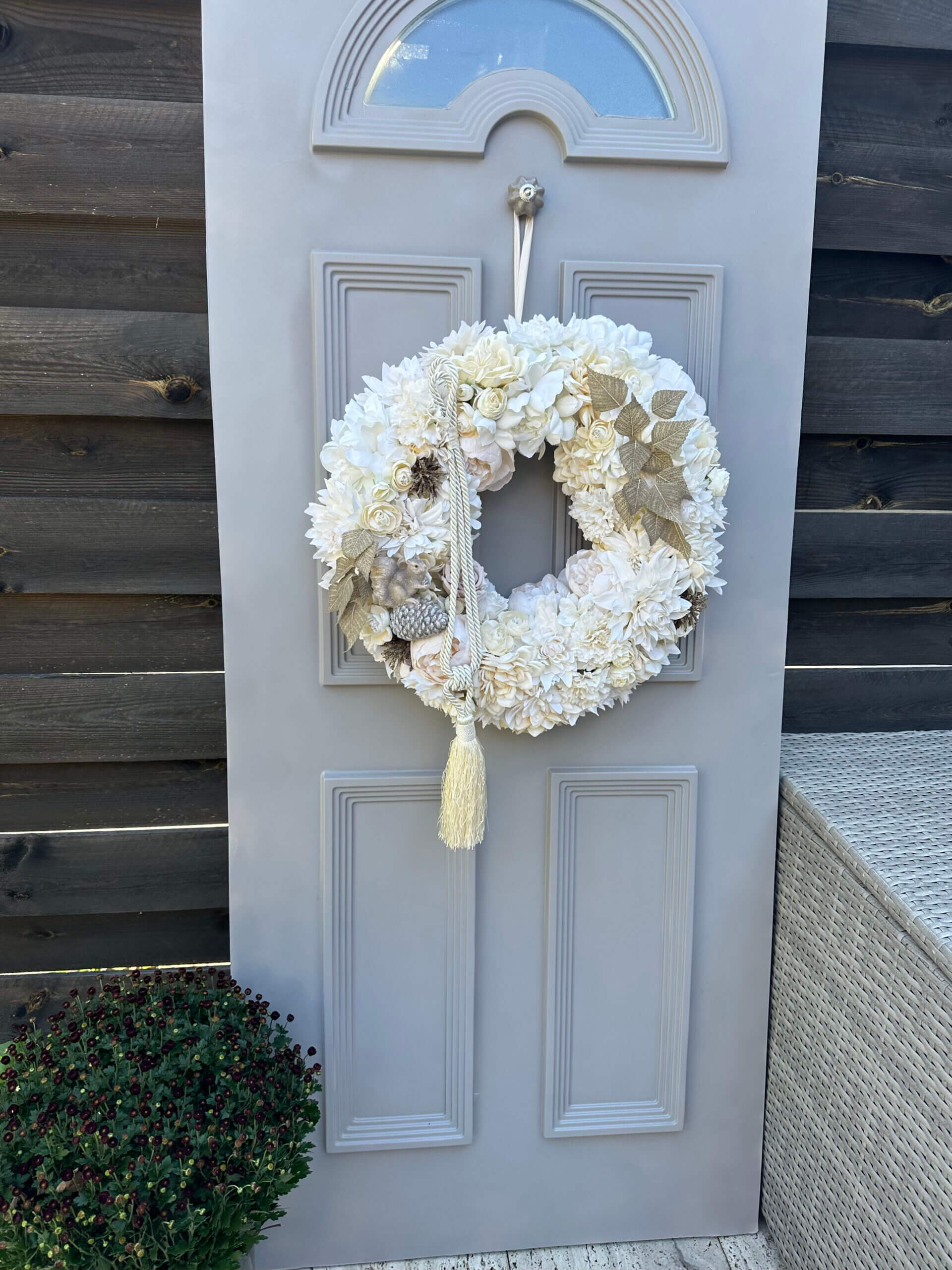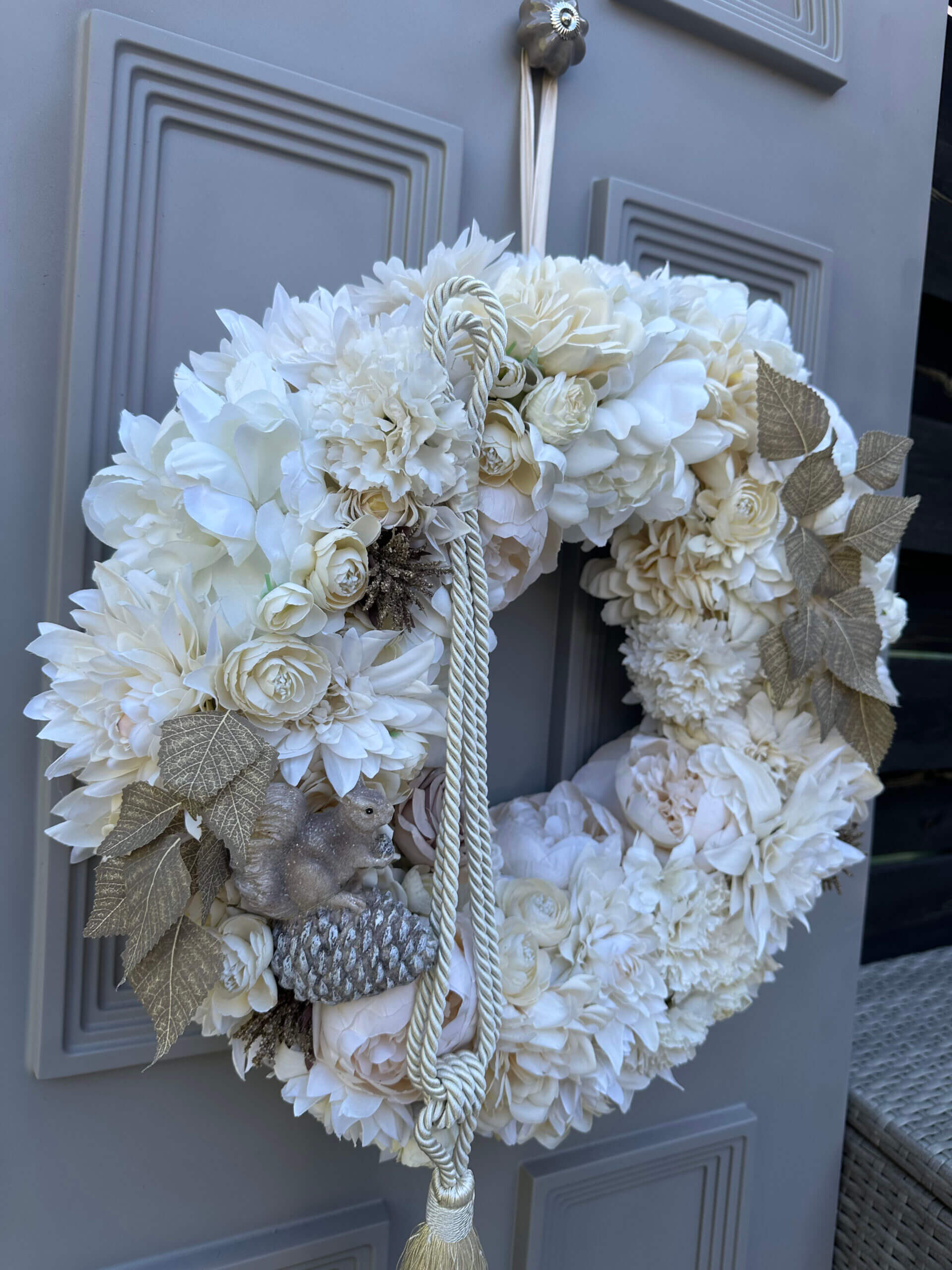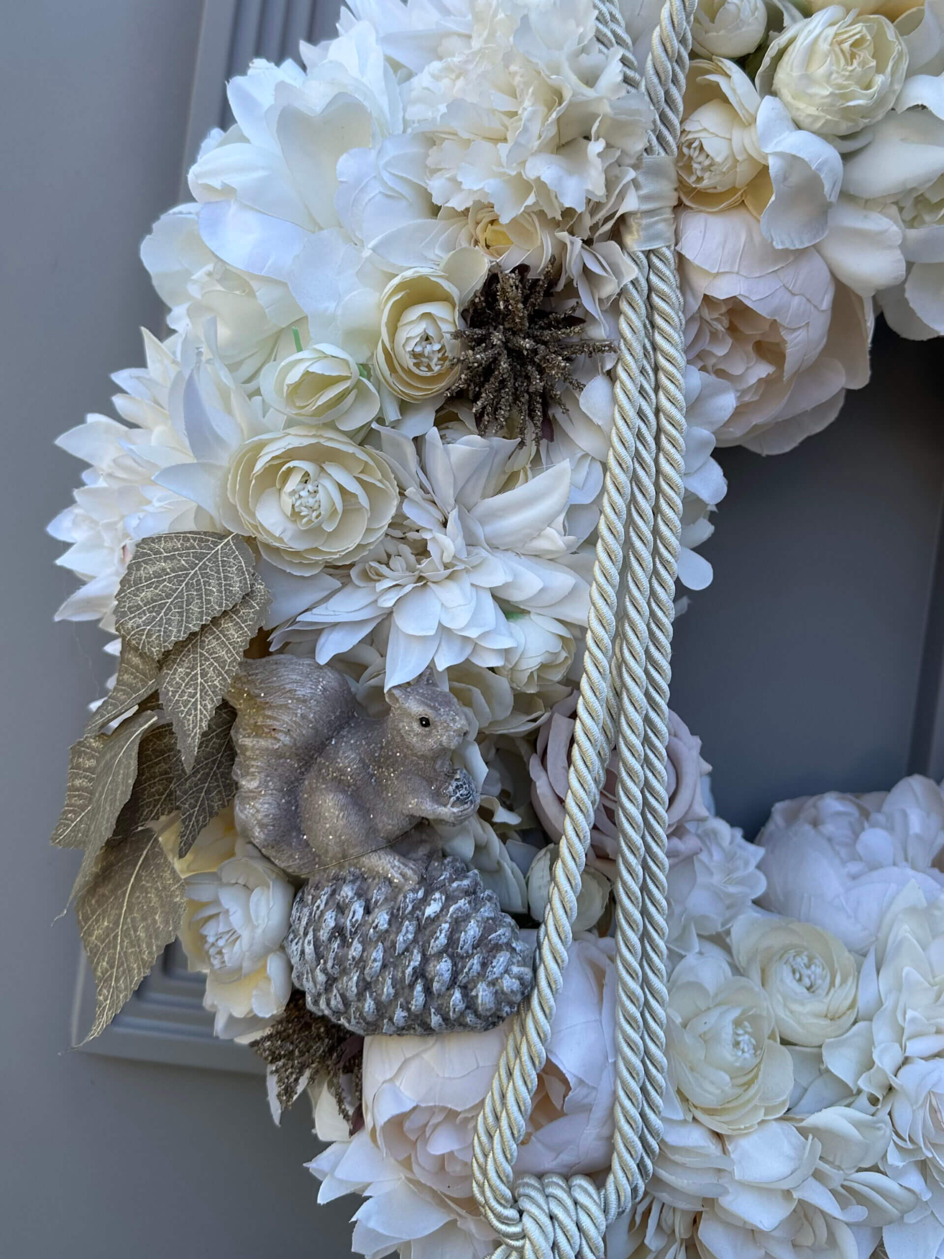 Fedezd fel a krémszínű selyemvirágokkal és egy aranyos mókussal díszített ajtódíszünket! Az 52 cm-es méretével lenyűgöző látványt nyújt, ideális választás a bejárati ajtód feldobására. A természetes hatású virágok és a játékos mókus tökéletes harmóniában vannak, így az őszi hangulat garantált!